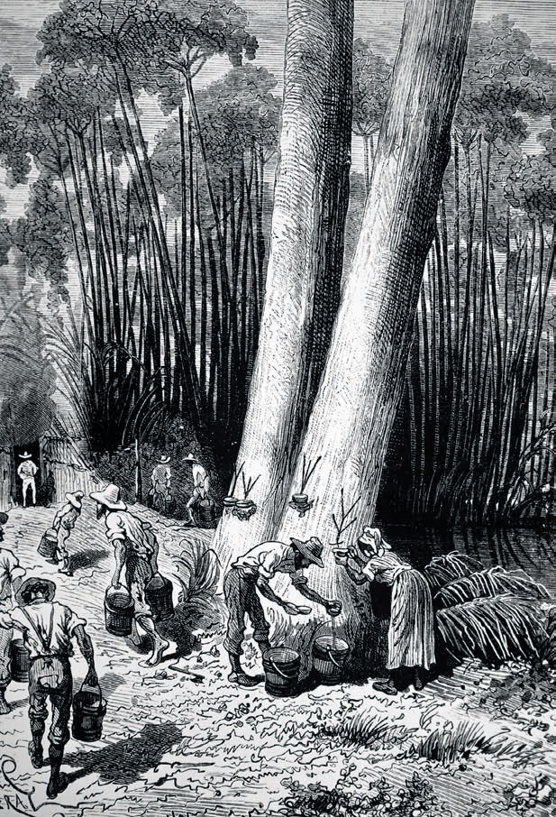 Дождевой лес Амазонии не подходил для устройства плантаций. Сок гевеи бразильской заготавливали, отправляя в экспедиции по его сбору. Индейцы, собиравшие латекс, меняли его на одежду, инструменты, другие товары из Португалии.