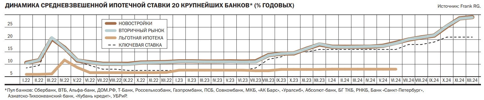 Таким образом, доля тех заемщиков, кто не может воспользоваться льготными программами по ипотеке и взять кредит по ставке 6% годовых, сейчас минимальна, отмечают участники рынка. Остаются лишь те, кому необходимо срочно решить квартирный вопрос, и они оформляют ипотеку даже под 25–30% годовых. В большинстве своем такие клиенты стараются погасить кредиты досрочно (в частности, за счет продажи другой недвижимости). «Кредиты по рыночным ставкам не только досрочно гасятся, но и оформляются на минимальный срок на небольшие суммы»,— подтверждает зампред правления Абсолют-банка Антон Павлов. Большинство же получателей льготной ипотеки (то есть практически все новые заемщики) не используют опцию досрочного погашения, предпочитая размещать свободные средства на депозитах с высокой доходностью. По данным ЦБ, в 2024 году объем досрочных погашений снизился до минимума с 2020 года и составил 1,5 трлн руб. (8% портфеля ипотеки на начало 2024 года) после 2,1 трлн руб. в 2023 году (15% портфеля).