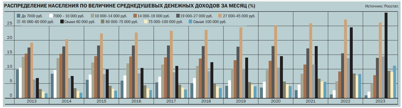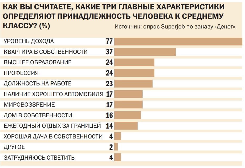 Кроме высоких окладов, по мнению россиян, представитель среднего класса должен иметь квартиру или дом в собственности, обладать высшим образованием и профессией, работать на значительной должности и иметь автомобиль.