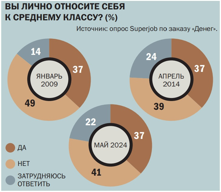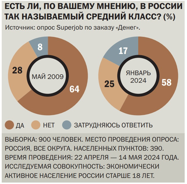 В средний класс верят в России далеко не все, выяснили аналитики Исследовательского центра Superjob, по заказу «Денег» опросив с 22 апреля по 14 мая 900 экономически активных россиян старше 18 лет из 390 населенных пунктов всех федеральных округов страны. Только 6 из 10 (57%) респондентов считают, что в России в принципе существует средний класс, хотя 15 лет назад так считали почти две трети респондентов (64%). Сегодня чаще верят в средний класс женщины (65%), представители среднего возраста (60%) и люди с невысоким доходом (61%). Реже всего в существование среднего класса верят мужчины (53%) с высокой зарплатой от 100 тыс. руб. в месяц (50%) старшего возраста (55%).