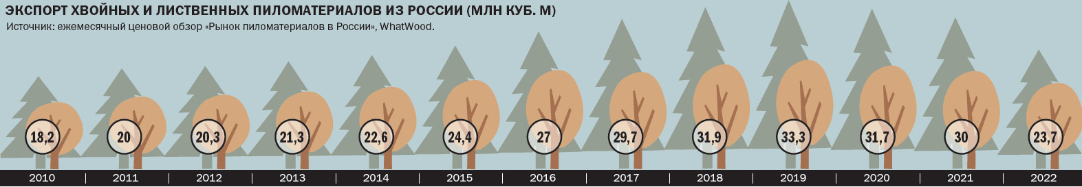 Китай остается ключевым потребителем продукции из необработанной древесины. Речь о кругляке из березы, так как в отношении необработанного или грубо переработанного леса хвойных и ценных лиственных пород (дуб, бук, ясень) с 1 января 2022 года по поручению президента РФ действует запрет на экспорт. Ранее государство постепенно снижало квоты. Сказались на экспорте и европейские санкции. До этого существенные объемы кругляка закупала Финляндия (последние поставки были в первом квартале 2022 года — около 800 тыс. кубометров). В первом квартале 2023 года негативная динамика сохранилась: поставки круглых лесоматериалов за рубеж упали в 2,7 раза, до 586 тыс. кубометров (почти 90% направлены в Китай).