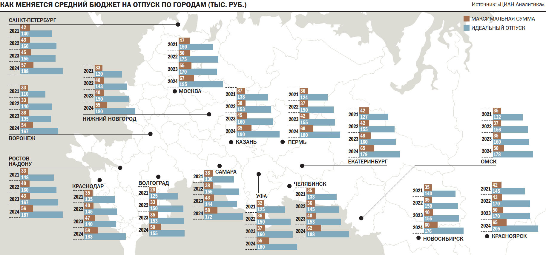 В Краснодаре, Самаре, Санкт-Петербурге, Ростове-на-Дону, Уфе и Нижнем Новгороде средний недельный бюджет — от 58 тыс. до 55 тыс. руб. Скромнее планируют провести отпуск жители Воронежа, Омска и Волгограда, потратив от 54 тыс. до 50 тыс. руб. За год, следует из данных SuperJob, среднестатистический отпускной бюджет вырос во всех крупных городах. Опережающая динамика зафиксирована в Челябинске и Новосибирске — в 1,5 раза.