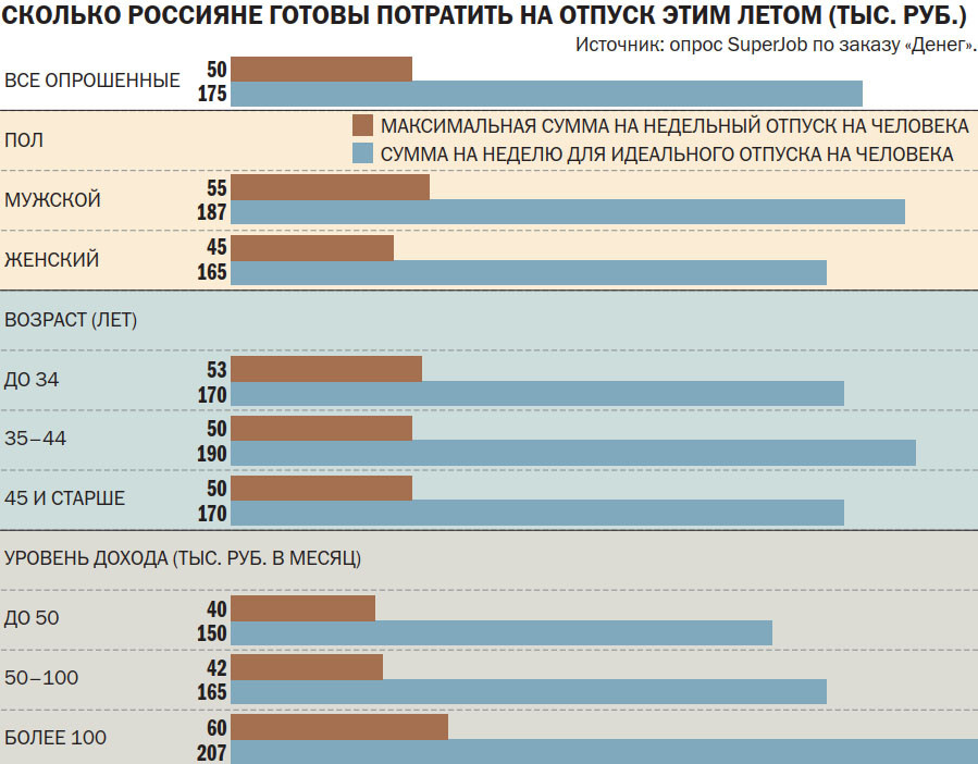 Средний бюджет недельного отпуска в этом году достиг 50 тыс. руб. на человека, посчитали аналитики SuperJob, по просьбе «Денег» опросив в мае—июне 13 тыс. экономически активных россиян из всех округов страны. Чтобы отпуск был идеальным, по мнению респондентов, требуется 175 тыс. руб. на человека. По сравнению с прошлым годом средний отпускной бюджет увеличился на 9%, а запросы на идеальный отпуск — на 11%.