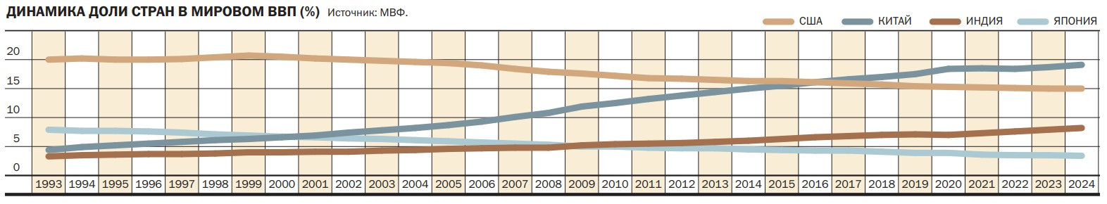 Доля Соединенных Штатов, которая в 1999 году составляла около 21% мирового ВВП, к настоящему времени упала до 15%. Вместе с тем доля Китая выросла с 4,4% в 1993 году до 19,1% в 2024 году, а доля Индии за то же время — с 3,3% до 8,2%. При расчете ВВП более традиционным способом, на основе обменного курса валют, результаты были бы иными. Однако применение ППС больше подходит для межстрановых сопоставлений, даже несмотря на то что этот метод тоже не исключает погрешностей в оценках. Именно поэтому сравнение различных экономик по ППС было принято на вооружение различными институтами, включая Всемирный банк.