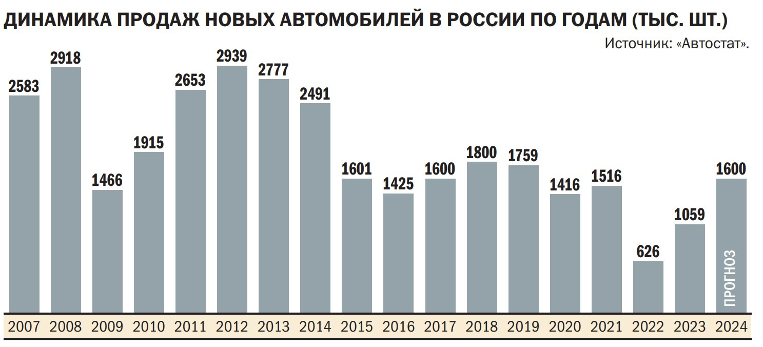 С ускорением в 50–60% по сравнению с прошлым годом российский авторынок подъезжает к финишу уходящего года. По данным «Автостата», за десять месяцев текущего года в России было продано 1,325 млн новых машин, что на 60% больше, чем за аналогичный период 2023 года. Даже при том, что за последние два месяца продажи на авторынке могут притормозиться, «Автостат» прогнозирует, что по итогам 2024 года он доберется до отметки в 1,6 млн авто, что на 51% больше, чем в прошлом (1,059 млн).