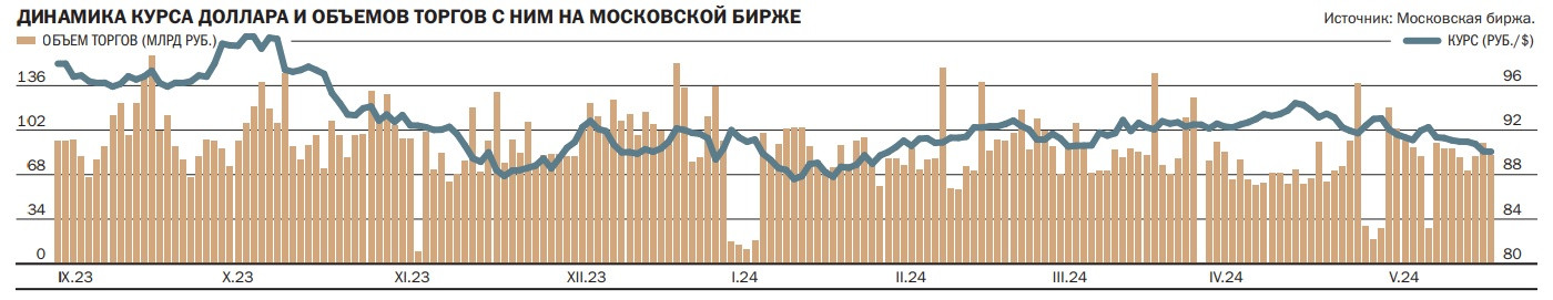 В конце мая курс доллара на Московской бирже впервые за четыре месяца опустился ниже 90 руб./$. 21 мая он достиг 89,75 руб./$ — минимума с 31 января. Даже с учетом последовавшей коррекции курс остался более чем на 4,5 руб. ниже локального максимума, установленного 17 апреля, и на 30 коп. ниже, чем в конце 2023 года.
