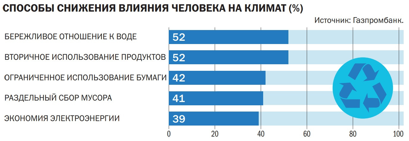Российское общество обеспокоено вопросами долгосрочного, успешного развития, следует из исследования Газпромбанка по итогам опроса более 1 тыс. респондентов по всей России. Так, 89% респондентов сообщили, что им известно о проблемах изменения климата, а 77% сталкивались с ними в повседневной жизни. При этом 87% из них считают эти проблемы серьезными. Также большинство опрошенных (83%) знают о влиянии человека, его жизнедеятельности на проблему изменения климата. В основном к таким факторам относят деятельность крупных производств, добычу ископаемых (по 65% опрошенных) и производство и потребление пластика (60%). Среди причин названы и те, что вызваны индивидуальным поведением: использование транспорта с двигателем внутреннего сгорания (48%), неосознанное потребление (46%), несортированные отходы (39%). Чаще проблемы климата с потребительскими привычками связывали представители молодежи. Опрошенные назвали привычки, которые могли бы снизить негативное влияние на климат. Чаще называли бережливое отношение к воде и вторичное использование продуктов (по 52%), поскольку это «самые понятные и доступные способы для аудитории». В числе ответов — ограниченное использование бумаги (42%), раздельный сбор мусора (41%) и экономия электроэнергии (39%).