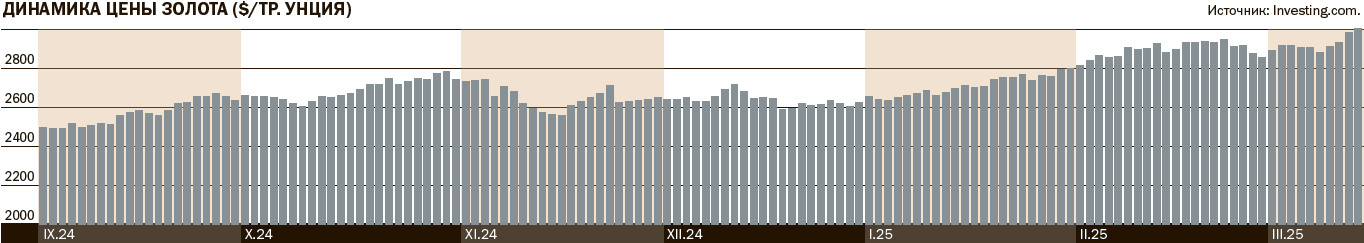Ключевой же причиной массовой скупки золота в мире, как и три года назад, стали действия новой администрации Белого дома. В начале февраля США ввели пошлины в отношении товаров из Канады, Мексики и Китая. В марте введены пошлины на продукцию из Европы. «Фактор политической нестабильности, равно как и экономической и любой другой, это всегда повод иметь золото в своем портфеле»,— считает портфельный управляющий УК «Альфа-Капитал» Дмитрий Скрябин.