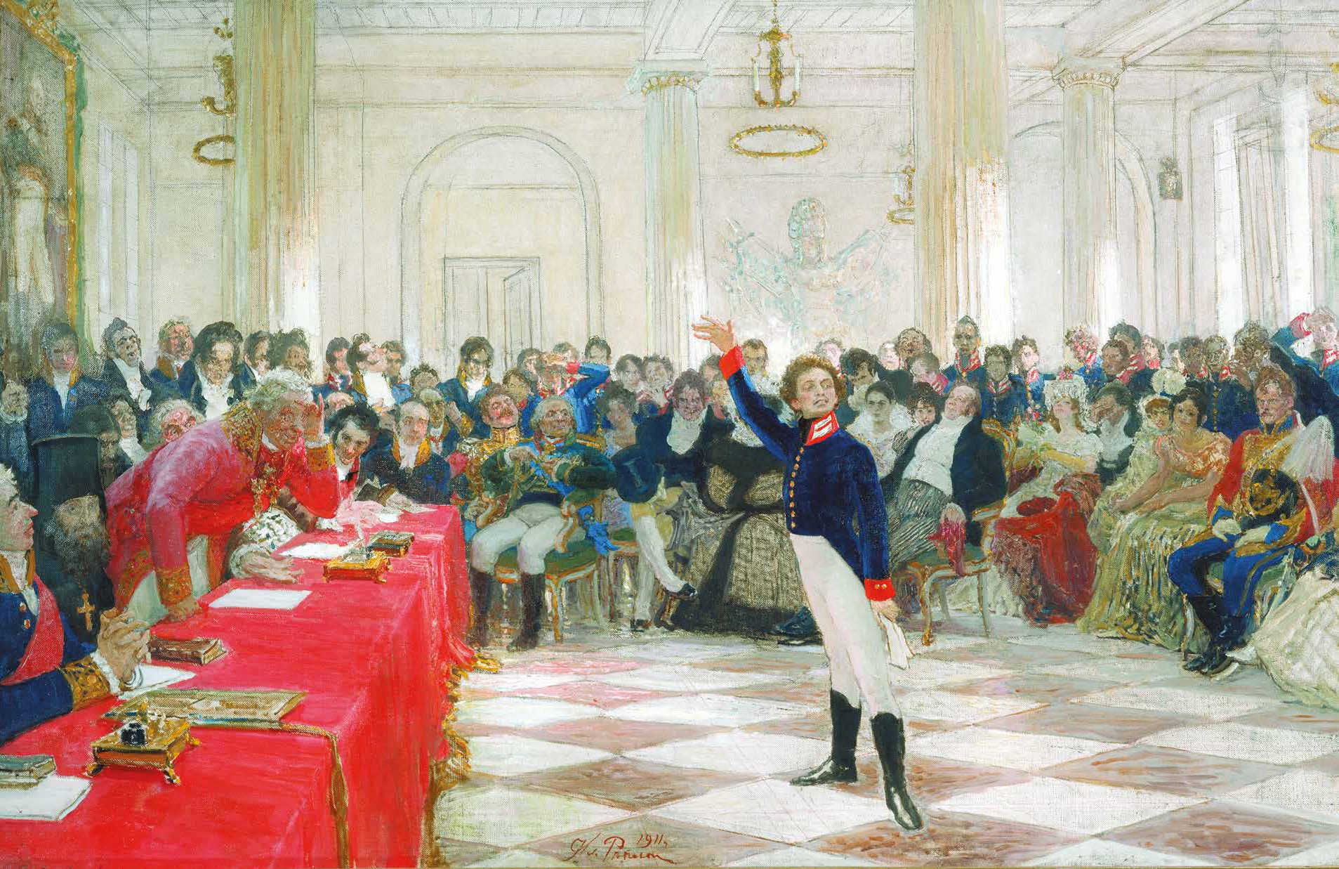 Илья Репин писал эту картину к 100-летию Царскосельского лицея. Заказ сделали представители лицейского сообщества. Художник взялся не раздумывая. Долго изучал исторические документы, литературные источники, воспоминания. Чтобы помочь Репину воссоздать атмосферу, лицеисты устроили инсценировку того знаменитого экзамена. 8 января 1815 года юный лицеист Александр Пушкин на экзамене прочитал стихотворение «Воспоминания в Царском Селе», чем привёл в восторг комиссию во главе с поэтом Гавриилом Державиным.