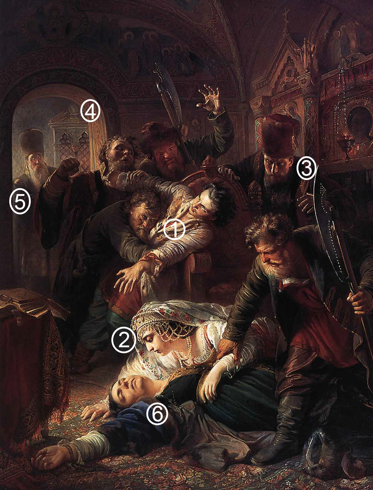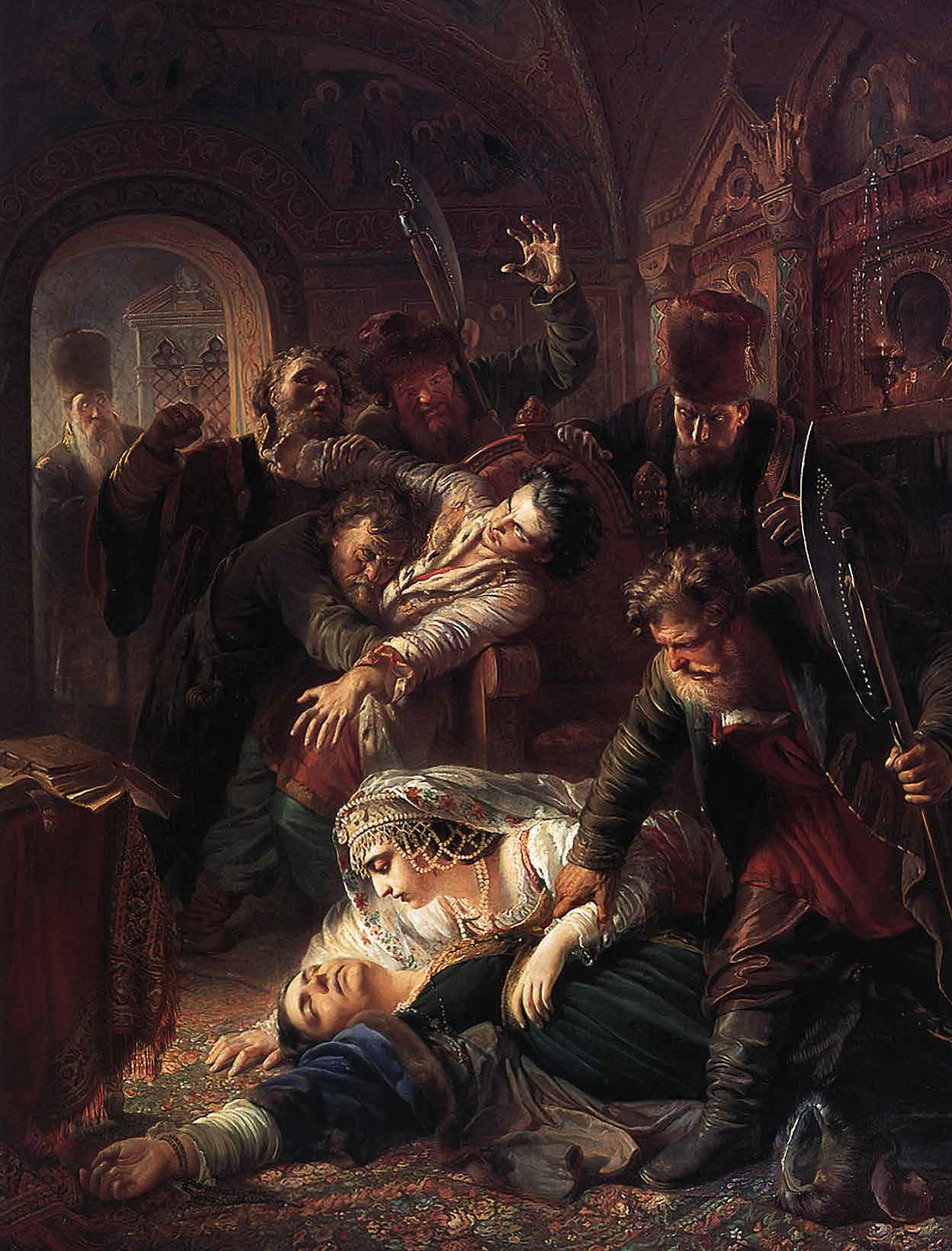 За эту картину, написанную в 1862 году, Константин Маковский получил малую золотую медаль Императорской Академии художеств, но от борьбы за более высокую награду отказался, поддержав так называемый бунт четырнадцати — выступление известных мастеров против новых правил конкурса и рутинной системы обучения. О протесте было доложено императору Александру II. Художники оказались под полицейским надзором. Правление сына Бориса Годунова Фёдора продлилось чуть меньше двух месяцев, в том числе из-за предательства со стороны воевод. Расправиться с царской семьёй велел лично Лжедмитрий. Избавление от наследников Годунова было условием его приезда в Москву. Маковский показывает события 10 июня 1605 года — сцену убийства Фёдора и его матери, царицы Марии.