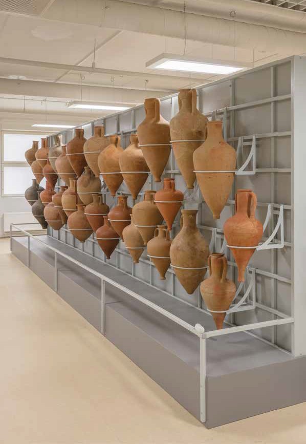 Амфоры — большие двуручные сосуды, служившие в Античности в качестве тары для транспортировки жидких продуктов — вина и оливкового масла. Форма амфор, как правило, имевших заострённое дно, была удобна для перевозки груза в трюме корабля: нижние части каждого из сосудов очередного верхнего ряда вставлялись в незаполненное пространство между четырьмя сосудами, находившимися рядом ниже. Таким образом, груз керамической тары располагался компактно, а сосуды не бились друг об друга при качке.