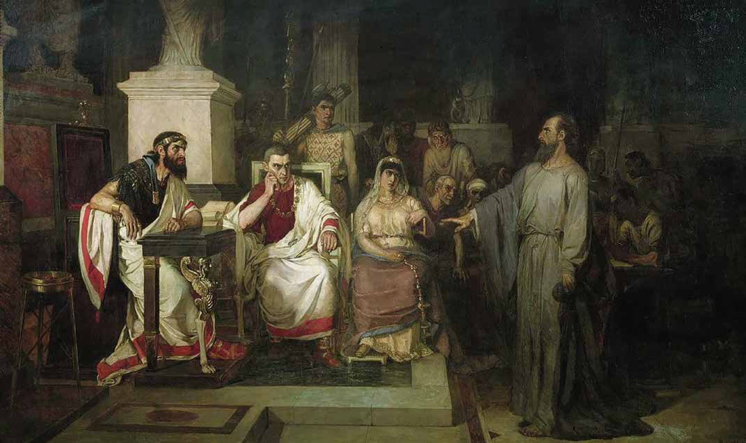 Согласно «Деяниям святых апостолов», во время визита в Иерусалим Павел был схвачен иудеями, которых категорически не устраивали отдельные нюансы его религиозных убеждений. Однако римское гражданство обвиняемого делало невозможной его казнь по решению местных властей. Пришлось везти его в Кесарию к прокуратору Антонию Феликсу. Тот выслушал и Павла, и его обвинителей и состава преступления в действиях апостола не нашёл. Однако ссориться с иудеями он не хотел, поэтому оставил проповедника в заточении на два года, периодически вызывая его к себе для бесед. Дело Павла досталось Порцию Фесту в наследство вместе с должностью прокуратора. Он также не счёл обвинения иудеев обоснованными и по требованию Павла передал его дело в Рим. Однако прежде предложил царю Агриппе и его сестре выслушать доводы христианина. Павел говорил убедительно. Недостаточно, чтобы обратить присутствующих в христианство, однако большинство, в том числе и царь, сочли апостола невиновным. «И сказал Агриппа Фесту: можно было бы освободить этого человека, если бы он не потребовал суда у кесаря».