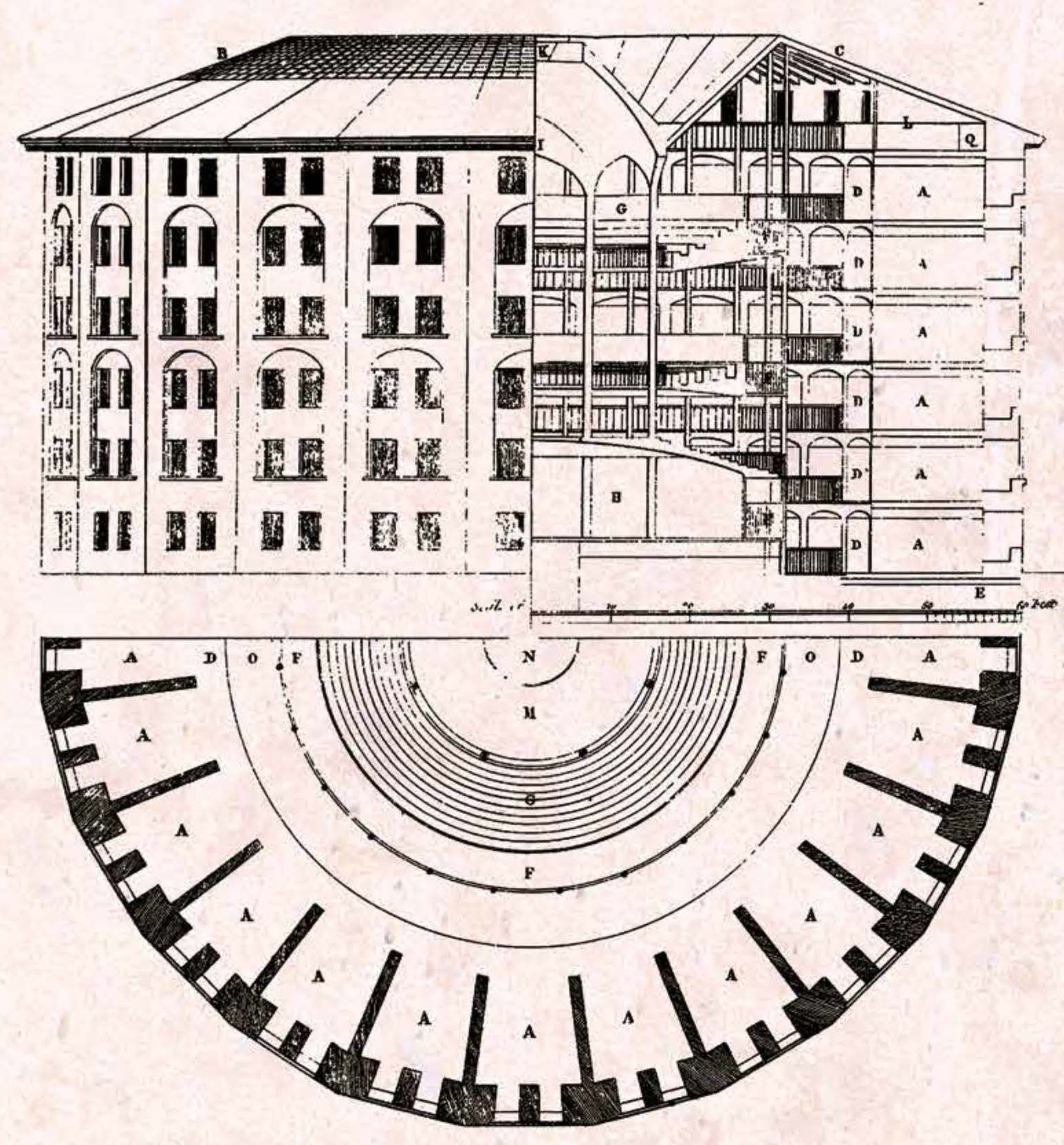 Круглая Арестантская башня, напоминавшая Паноптикон, была возведена на острове Новая Голландия в 1829 году по проекту и под надзором Александра Штауберта. Предназначалась она для размещения только что сформированных трёх флотских арестантских рот общим числом 360 человек. Кирпичное здание имело форму кольца с внутренним двором, так что обойтись, по Бентаму, силами одного надзирателя не удалось.