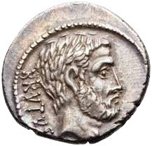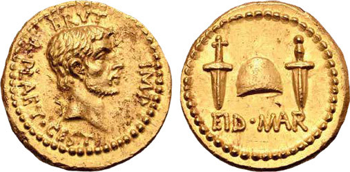 Этот ауреус (от латинского aureus — золотой) отчеканен в 42 году до н. э. С убийства Цезаря прошло два года, в Риме бушевала гражданская война. Бруту и Кассию не удалось убедить сенат и народ в том, что их дело было правым: Марк Антоний в своей грубоватой манере настроил всех против убийц Цезаря. В 43 году Брут и Кассий уже были в проскрипционных списках, а Антоний и Лепид заключили союз с Октавианом.