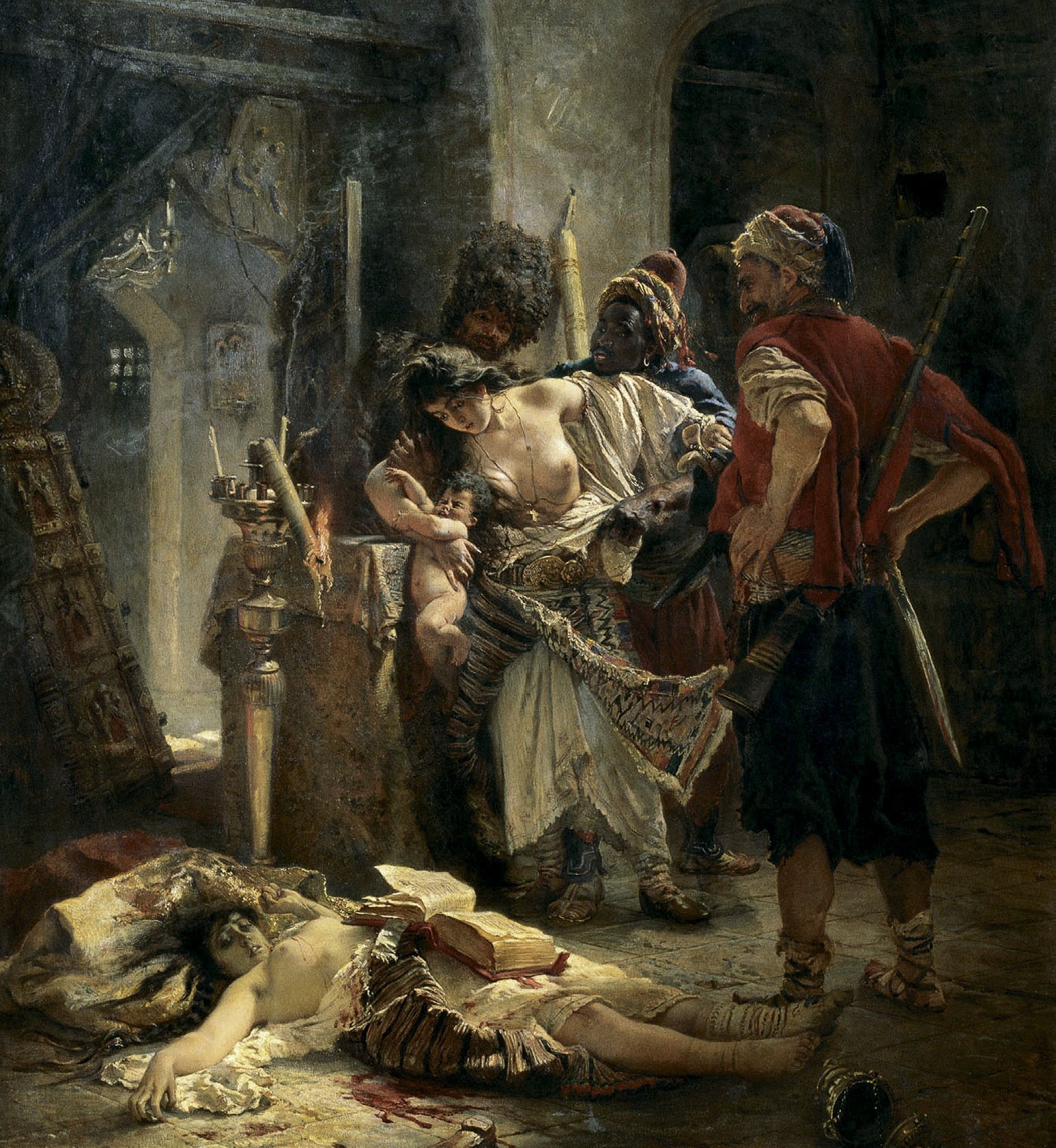 Картина написана Константином Маковским в 1877 году после поездки на Балканы, где художника потрясли рассказы о зверствах турок, подавивших болгарское восстание 1876 года (Апрельское восстание). Многие русские симпатизировали болгарам, участвовали в их освободительной борьбе. За положением на Балканах внимательно следила российская печать, эта тема была одной из самых важных во время внешнеполитических контактов главы Российской империи. Восстание началось 19 апреля 1876-го с нападения на турецких полицейских, приехавших в болгарский городок Копривштицу для обысков местных жителей, а закончилось в середине мая, когда был разгромлен последний из организованных отрядов повстанцев. За время ожесточённых столкновений было сожжено 80 сел. Только на юге Болгарии погибли более 30 тысяч человек. Это стало одной из причин разгоревшейся в 1877 году Русско-турецкой войны.