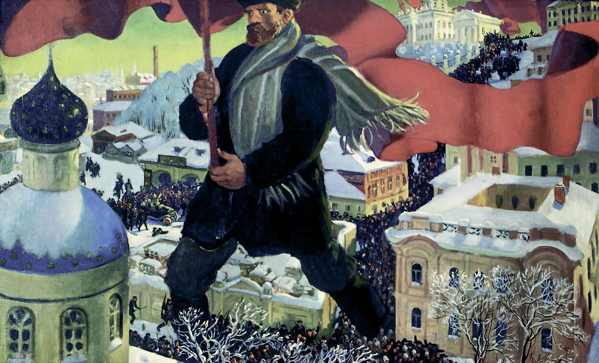 До революции Кустодиев нарисовал сотни картин, где идиллически изображал жизнь купцов (не забыл, кстати, создать и портрет царя Николая II). Причём уютным фоном часто служили виды православных храмов и монастырей. Поэтому обращение к теме монстра, который чудовищной массой надвигается на церковь, оказалось неожиданным для друзей и почитателей художника.