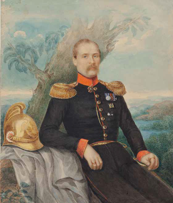 В Государственном историческом музее хранится акварельный портрет военного с пышными рыжими усами. Судя по эполетам с бахромой, перед нами штаб-офицер — майор, подполковник или полковник. Золотая портупея по поясу для сабли указывает, что офицер числится в кавалерии. На его шее изображён орден Святой Анны 2-й степени («Анна на шее»). На груди серебряная медаль за взятие приступом Варшавы 25 и 26 августа 1831 года, бронзовая дворянская медаль в память Отечественной войны 1812 года и серебряный польский крест Virtuti militari 5-й степени.