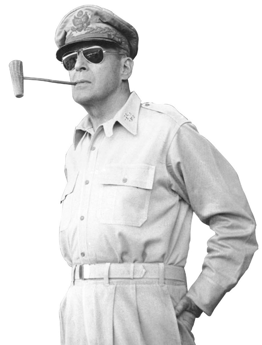 До Первой мировой войны его карьера строится довольно плавно, хоть и с некоторыми приключениями вроде «битвы за паровозы» при пограничном инциденте с Мексикой. Капитан Дуглас Макартур проявил тут, как пишут в сводках, инициативу и смекалку, то выкупая, то отбивая локомотивы, без которых целые составы простаивали на мексикано-американских путях. Это было в 1914-м, когда Соединённые Штаты ещё не помышляли воевать в Европе. А через три года, когда американские силы собрались, наконец, воевать с Германией, майор Макартур, уже признанный военный инженер, предлагает командующему Национальной гвардией генералу Манну собрать воедино подразделения из разных штатов и образовать ещё одну дивизию для отправки во Францию. И все знамёна пусть «воссияют над страной, как радуга». И генерал, и министр обороны идею одобрили, а Макартур, произведённый в полковники, получил свою первую пехотную должность и стал начальником штаба 42-й «Радужной» дивизии. Соединение творило чудеса на Западном фронте. Дуглас Макартур, уже бригадный генерал, вернулся домой увешанный крестами и медалями. Ура.
