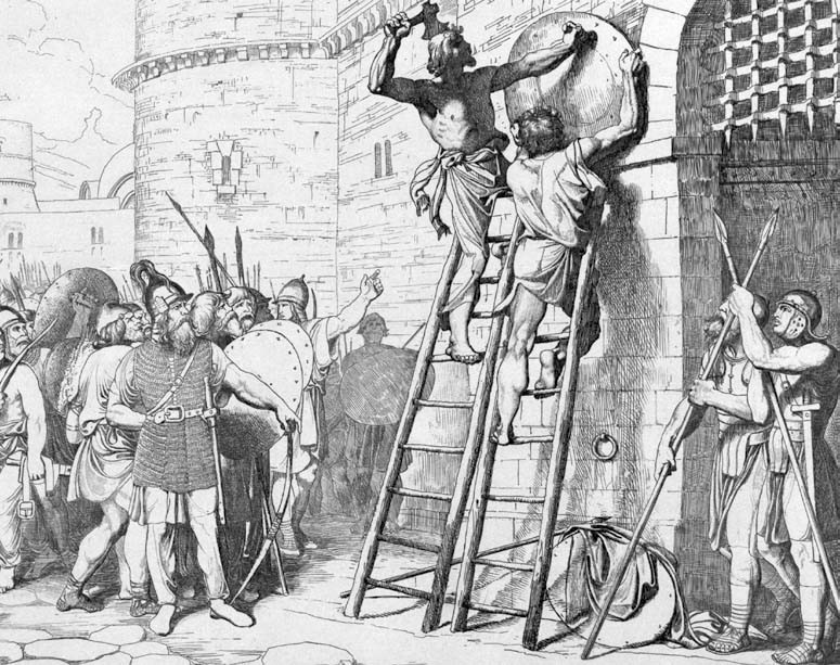Если мы будем искать аналоги этого жеста, то обнаружим, что у викингов поднятый над городскими стенами (а чаще — на мачте корабля) щит был не знаком победы, а сигналом о готовности либо к миру, либо к войне — всё зависело от его цвета: белый — мир, красный — война.