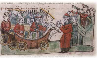 Поход Олега на Царьград, согласно «Повести временных лет», имел место в 907 году. Греки тогда закрыли вход в узкий залив Золотой Рог, и Олег велел вытащить суда на сушу и поставить их на колёса. Флотилия под парусами «докатилась» до города, греки запросили мира и согласились платить дань.
