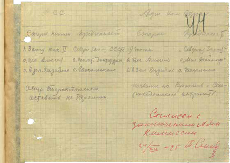 Переименованию, разумеется, предшествовало предварительное обсуждение вопроса. Как можно видеть по характеру документа, процесс такого обсуждения происходил достаточно неформально. На расчерченном карандашом листке можно видеть варианты новых названий, предложенных двумя структурами, — Административной комиссией ВЦИК и почему-то Революционным военным советом, отвечавшим за руководство вооружёнными силами. Реввоенсовет настаивал на идеологически ярких топонимах, предлагая назвать остров Цесаревича Алексея островом Пролетарской Диктатуры, а