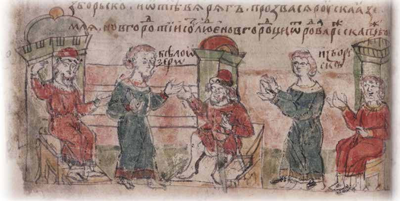 Княжение варяжских братьев Рюрика, Синеуса и Трувора. Миниатюра Радзивилловской летописи, XV век