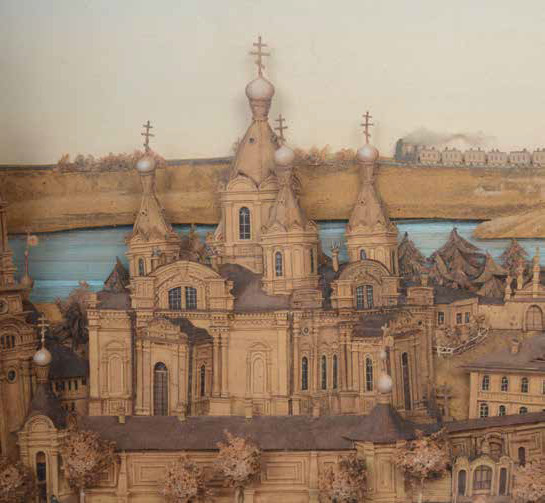 К концу XIX века город стал преображаться. Это было связано с активной торговлей зерном, перегрузкой товаров с кораблей, пришедших по Волге, на небольшие суда, державшие путь на Балтику и в столицу империи. Для строительства новых зданий использовался находившийся у стен монастыря песчаный карьер, называемый в народе «Песочная яма». Она также запечатлена на диораме, причём наполненная водой.