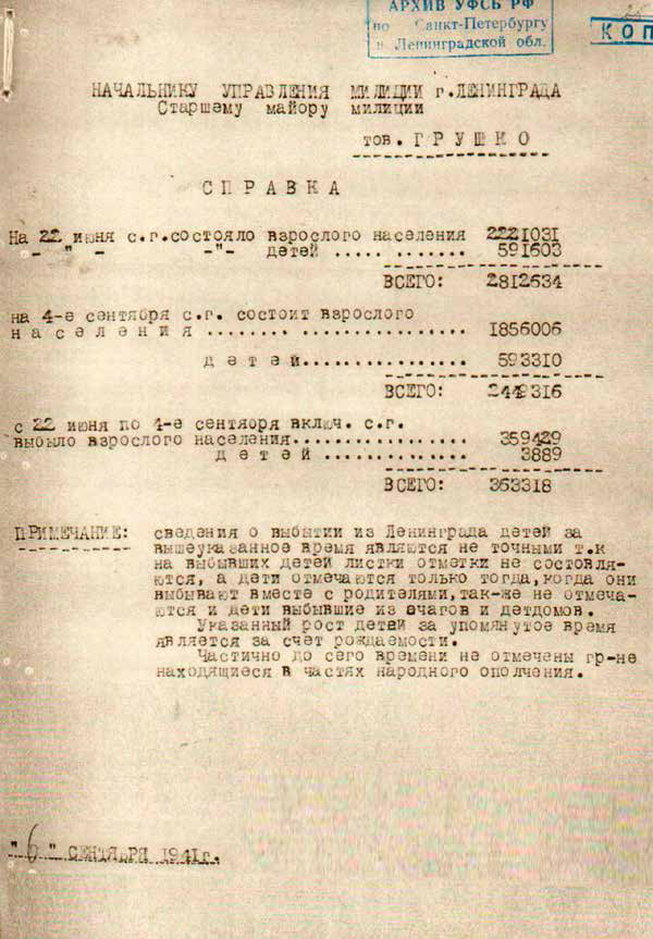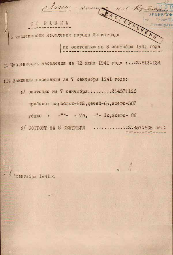 Какова была численность населения во втором по величине городе страны 22 июня 1941 года? Сколько осталось в нём к первому дню блокады 8 сентября? Сколько ленинградцев эвакуировалось до открытия Дороги жизни через Ладогу? Ответы на эти вопросы дают документы архива петербургского УФСБ и РГАСПИ.