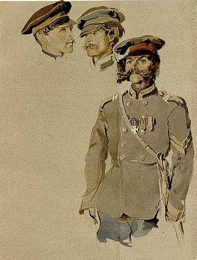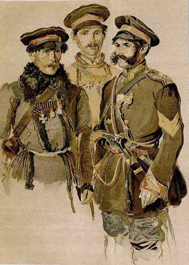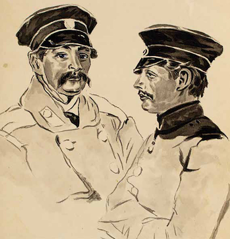 Как бы там ни было, к 1917 году в Лермонтовском музее хранилось множество реликвий, которые после революции поступили в Пушкинский дом Академии Наук. Советским учёным предстояла огромная работа по исследованию полученных фондов. Среди них находилась небольшая (20,8 х 19,6 см) акварель с двумя офицерами, которая считалась рисунком самого поэта. В нижней части листа имелась карандашная подпись на французском языке: «Два флигель-адъютанта Е.В. (Его Величества) Императора». На следующей строке были фамилии офицеров, но, увы, они оказались обрезаны.