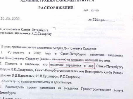 Речь пойдёт о подписанном в мае 2002 года распоряжении тогдашнего губернатора Санкт-Петербурга Владимира Яковлева установить памятник академику Сахарову. Что особенного, спросите вы. А я отвечу: вспомните, с какой натугой и внутренним сопротивлением наши власти, федеральные и региональные, выдавливали из себя какие-то слова по поводу 100-летия Андрея Дмитриевича.