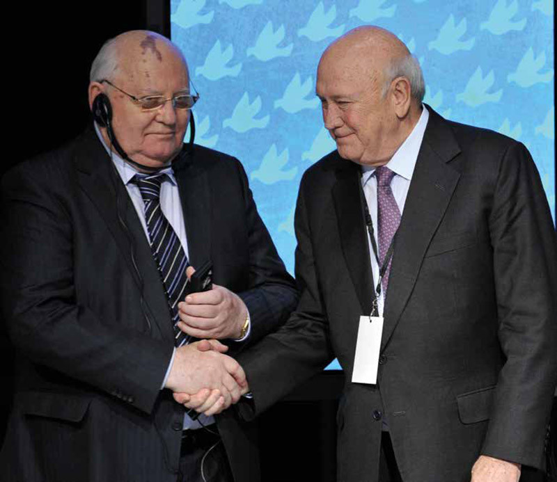 Фотография 2012 года: двое немолодых мужчин в деловых костюмах жмут друг другу руки на сцене. Если не вглядываться, можно принять их за близких родственников. Михаил Горбачёв и Фредерик де Клерк, два бывших президента на форуме лауреатов Нобелевской премии мира.