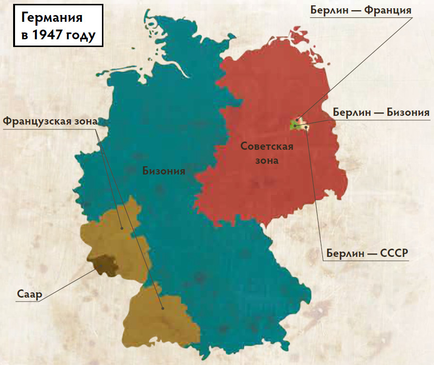 Ситуация, связанная с разрушениями и отсутствием средств на импорт, усугубляется тем, что в стране четыре зоны оккупации — восточная часть занята СССР, французы оккупируют территории, примыкающие к Франции, остальное делят Великобритания и США. Это осложняет транзакции, требующие перемещения товаров между зонами. Британцы и американцы договариваются о слиянии с 1947 года своих зон в одну, Бизонию, а французская остаётся под отдельным протекторатом гораздо дольше.