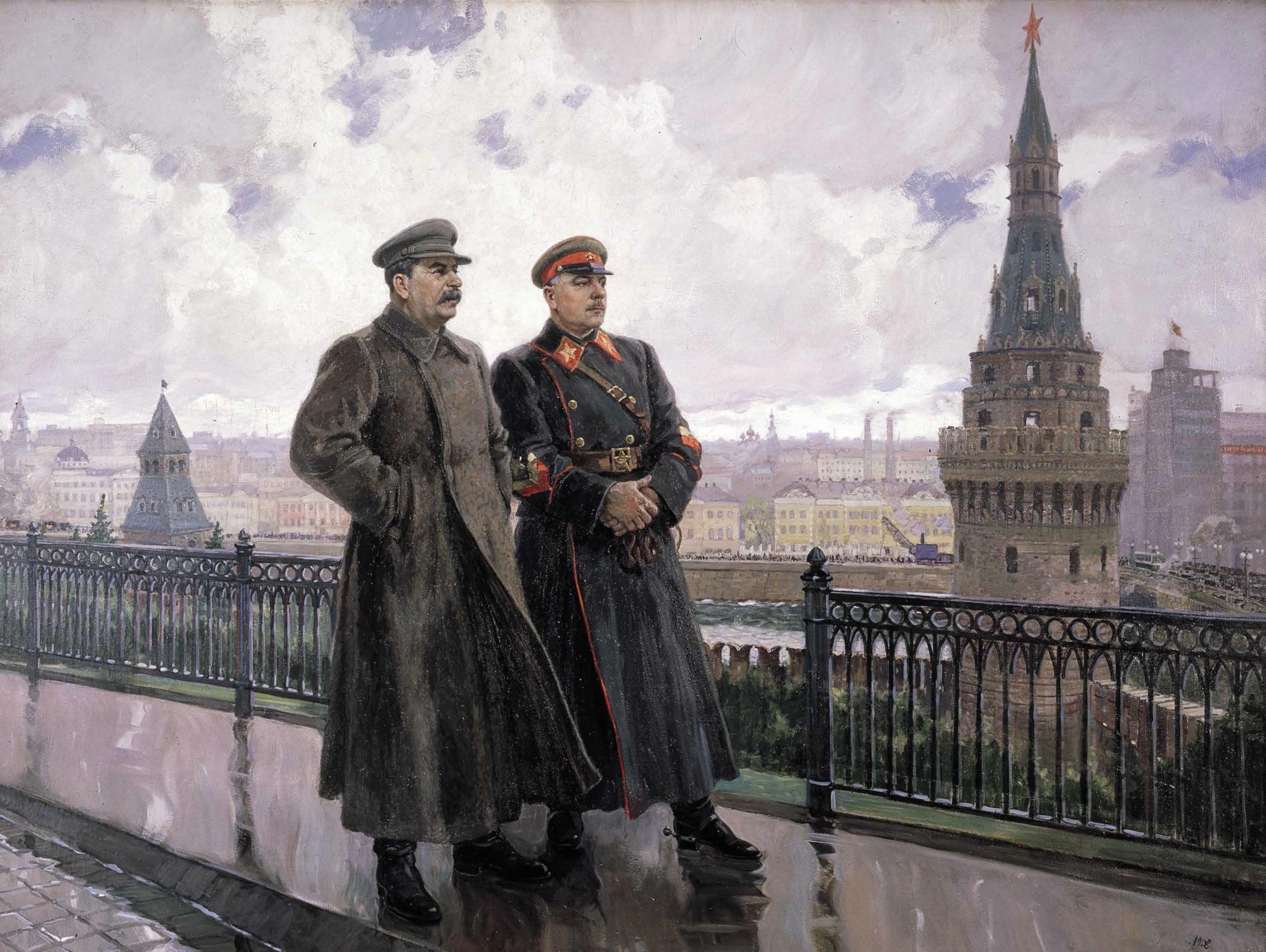В сюжете картины «И. В. Сталин и К. Е. Ворошилов в Кремле» — два крупнейших деятеля СССР, которые прогуливаются по кремлёвскому тротуару на фоне расползающихся туч. В народе эту картину прозвали «Два вождя после дождя».