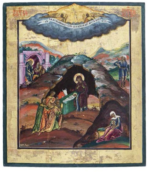 Двадцать лет назад из Ревды привезли «Рождество Христово». Необычная икона. Широкая зелёная обводка — опушь, характерные горки и в левом нижнем углу дата 1887. Для старообрядческой иконы — большая редкость, обычно даты пишут буквенными обозначениями от сотворения мира.