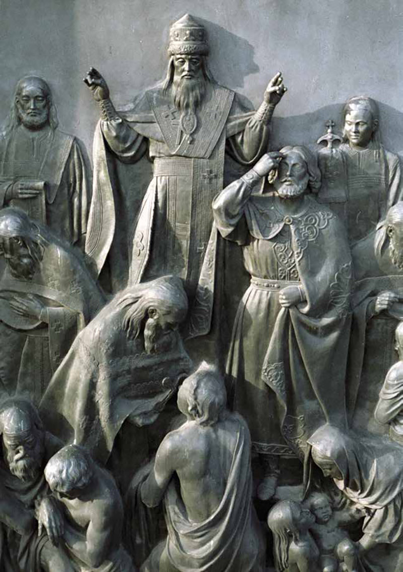История имянаречения в России увлекательна, драматична, а одна из её особенностей — ведущаяся несколько столетий война имён. Она началась в Х веке с христианизации " Фрагмент барельефа «Крещение Руси» на памятнике князю Владимиру, установленном в Киеве в 1853 году Руси. Крещение предполагало дарование христианского имени, а так как своих святых пока ещё не было, не имелось и русских имён, которые принимала бы христианская церковь. Началась борьба между языческими славянскими и каноническими иноязычными греческими, римскими и древнееврейскими именами.