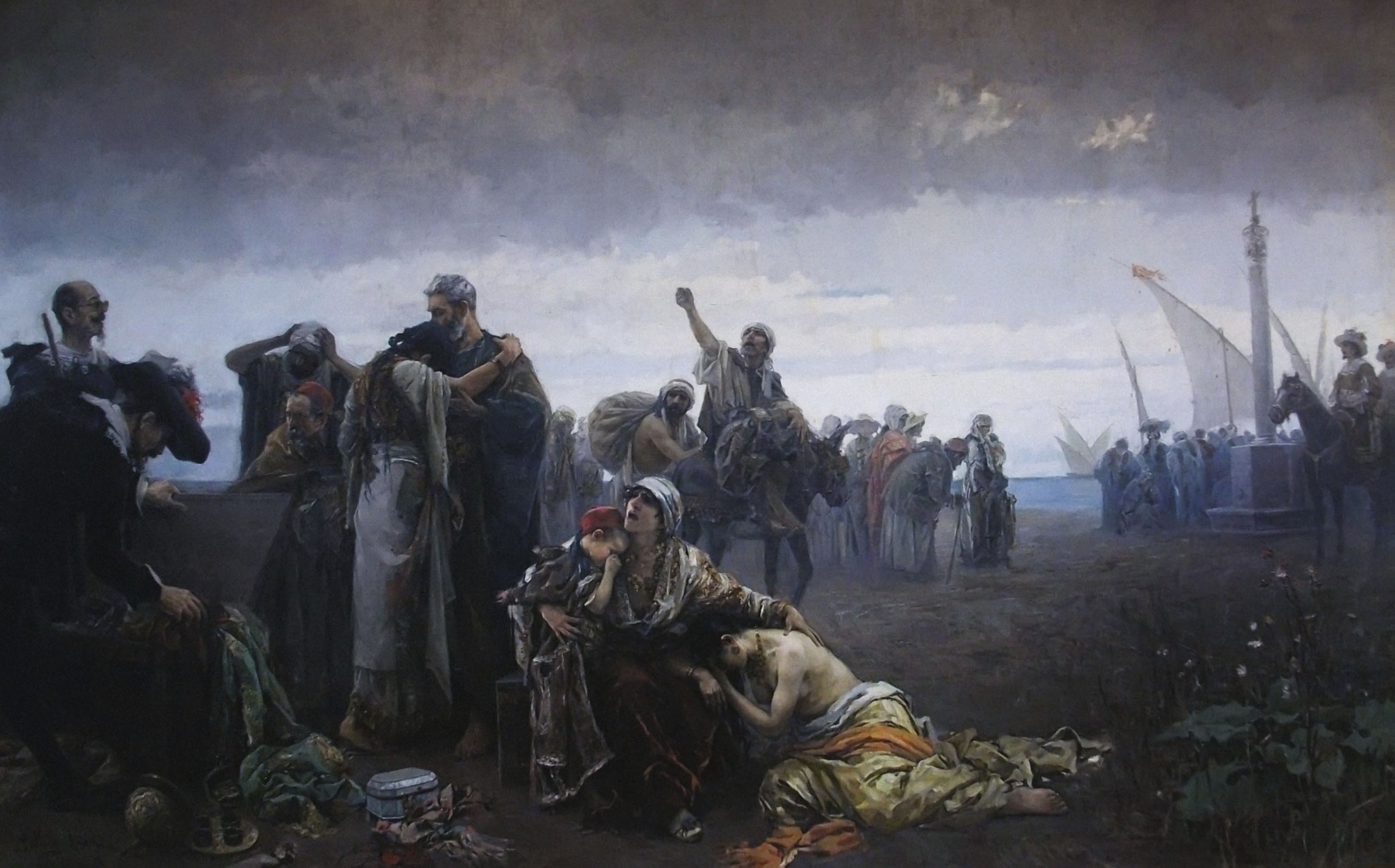 Габриэль Пуидж Рода — испанский художник из бедной крестьянской семьи, который благодаря своему таланту поступил в Королевскую академию изящных искусств Сан-Карлос, а после ещё выиграл стипендию и переехал в Рим, где продолжил обучение мастерству. Картину «Изгнание морисков» (1894) он написал уже в зрелом возрасте. Художник обращается к востребованному в Испании сюжету — массовой депортации нехристианских жителей Испании, в том числе морисков — потомков мусульман, которые отказались от своей веры в пользу христианства. Власти видели в них источник нестабильности, а Альпухарское восстание морисков и сообщения о сотрудничестве их с турками или мусульманскими пиратами давало короне ещё больше поводов для подозрений.