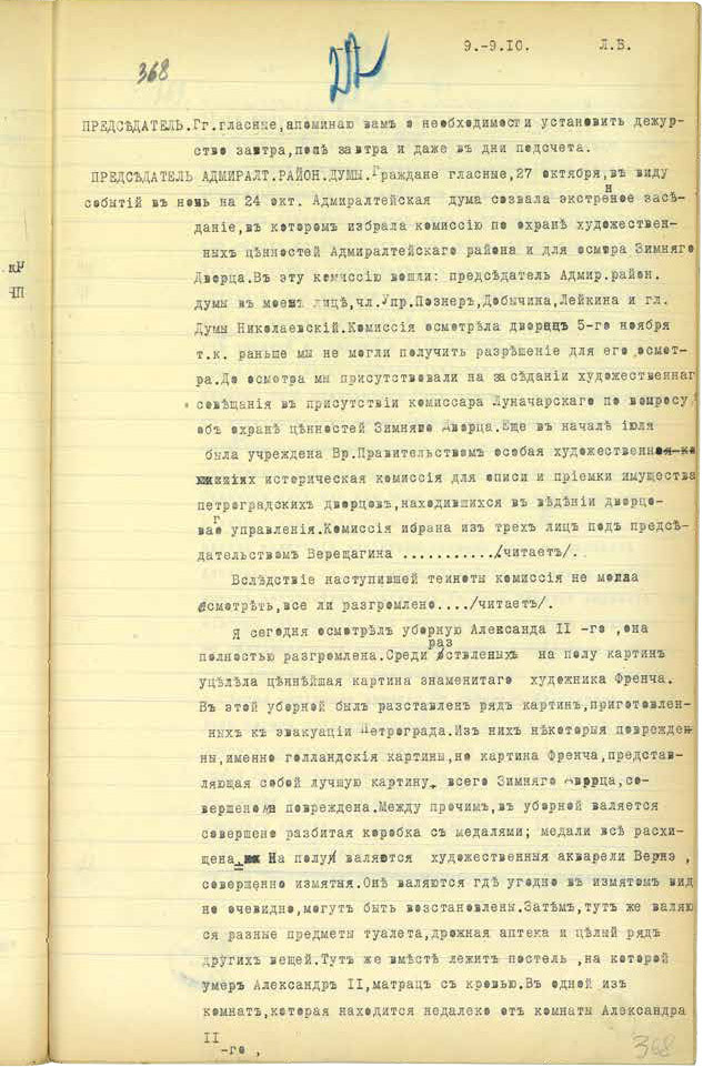 На заседании 11 ноября Дума заслушала сообщение председателя Адмиралтейской районной думы, который в составе комиссии из пяти человек 5 ноября побывал в Зимнем дворце и смог на месте ознакомиться с плачевным состоянием ряда его помещений, куда в ночь штурма ворвались группы вооружённых людей. По его свидетельству, особенно досталось императорским комнатам. Так, уборная Александра II, по заявлению комиссии, была полностью разгромлена: «В этой уборной был расставлен ряд картин, предназначенных для эвакуации Петрограда. Из них некоторые повреждены, именно голландские картины, но картина Френча (очевидно, речь идёт о Франческо Франча — итальянском художнике, ювелире, гравёре и скульпторе. — А. К.), представляющая собой лучшую картину всего Зимнего дворца, совершенно не повреждена… в уборной валяется совершенно разбитая коробка с медалями, медали все расхищены. На полу валяются художественные акварели Вернэ (Клод Жозеф Верне — знаменитый французский художник. — А. К.), совершенно измятые. Они валяются где угодно в измятом виде, но очевидно могут быть восстановлены… В одной из комнат, которая находится недалеко от комнаты Александра II-го весь пол, столы и стулья покрыты густым слоем гагачьего пуха, выпущенного из суконных подушек, притащенных из уборной супруги Александра II-го».