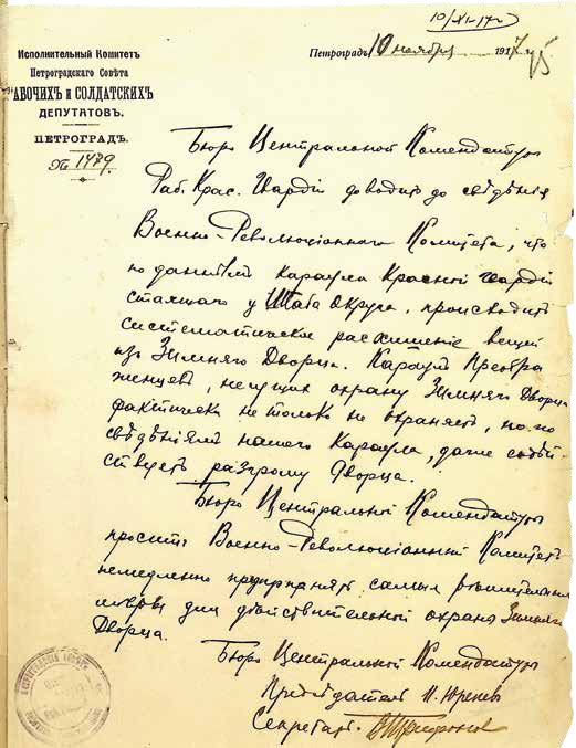 «В полковые и флотские комитеты. В ночь с 25 на 26 октября в Зимнем дворце, составляющем неотъемлемую собственность русского народа, похищены ценные художественные вещи.