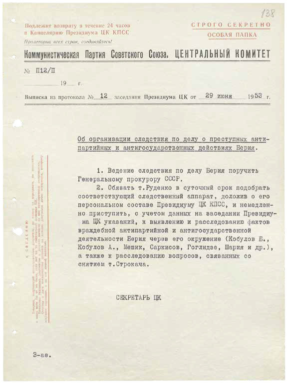 Дело Берии обсуждалось на особом пленуме ЦК с 2 по 7 июля 1953 года. Георгий Маленков выступил первым, обвинив министра внутренних дел в злоупотреблении властью, слежке за коллегами, попытке проведения независимой внешней политики по каналам МВД, манипулировании процессами амнистии для личной выгоды и т. д. Он осмелился и на мягкую критику Сталина: «У нас накопились за многие годы значительные ненормальности… у нас годами не собирался пленум ЦК, у нас последние годы Политбюро перестало нормально функционировать как высший партийный орган в период между пленумами ЦК… Всякий член ЦК, какой бы пост он ни занимал, должен находиться под соответствующим партийным контролем. Деятельность любого из руководителей должна протекать под руководством ЦК партии».