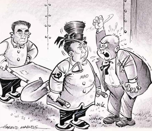 Карикатура обыгрывает заявление Китая, что Хрущёв похоронил себя, встав на путь оппортунизма и отказавшись от «заветов Сталина».