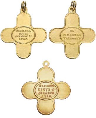 Ниже звезды приколот хорошо узнаваемый золотой крест на банте из георгиевской ленты. Такие кресты получили все офицеры, участвовавшие в знаменитых штурмах турецкой крепости Очаков 6 декабря 1788 года или крепости Измаил 11 декабря 1790 года в случае, если их не наградили за штурм орденом Святого Георгия или Святого Владимира. Всего на Монетном дворе отчеканили по 410 крестов каждого типа.