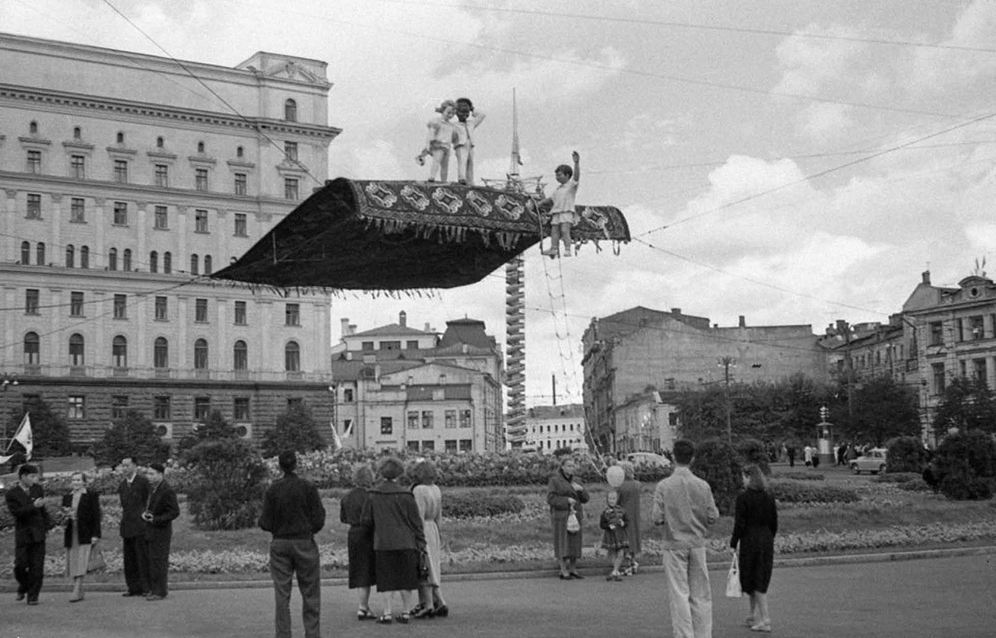 Снимок сделан 27 июля 1957 года, накануне открытия в Москве VI Всемирного фестиваля молодёжи и студентов. Ковёр-самолёт с фигурами детей трёх рас был временной скульптурой, крепился тросами и составлял единую композицию с магазином «Детский мир», который открылся 1 июня того же года и должен был символизировать перед гостями фестиваля счастливое детство советской ребятни.