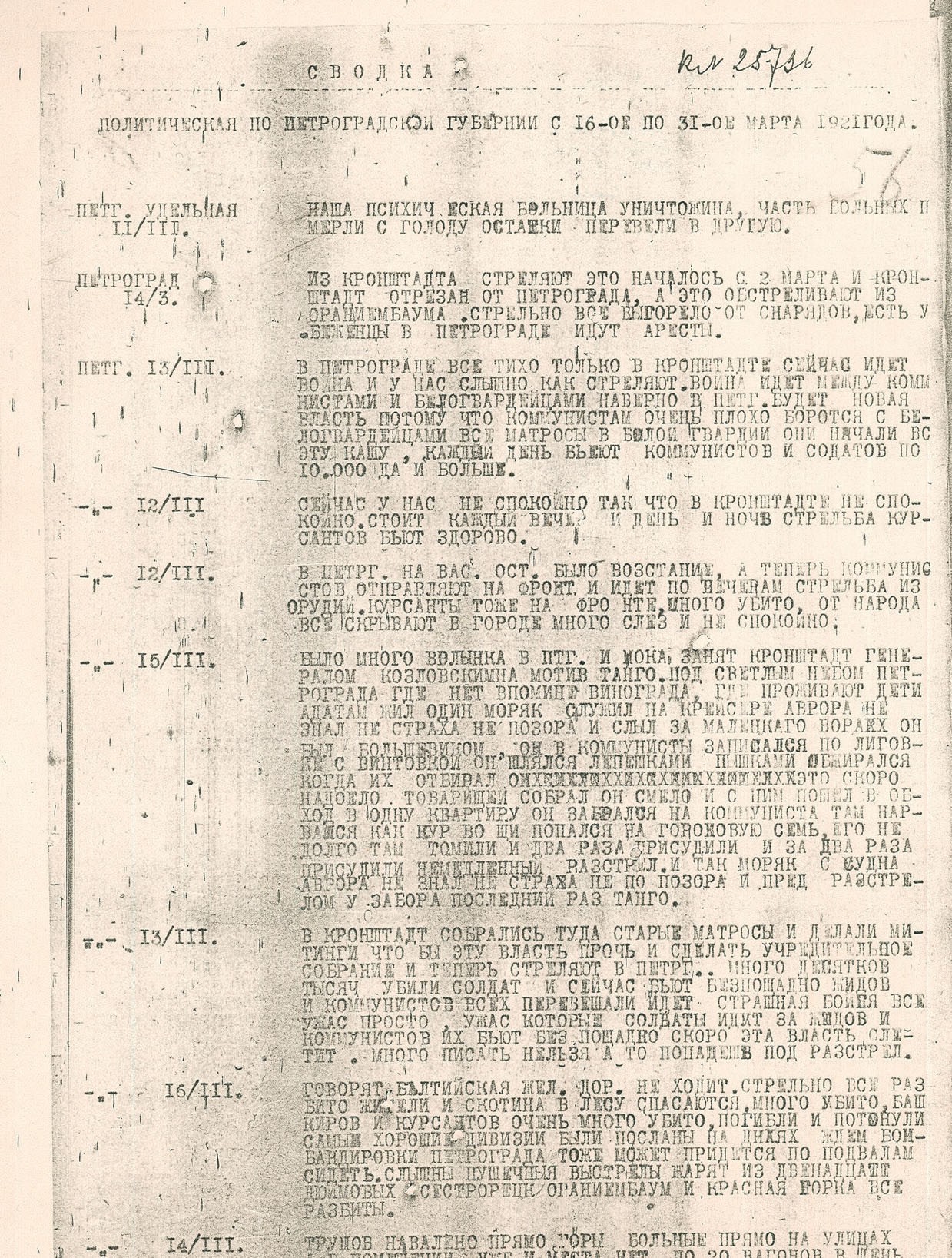 В политической сводке по Петроградской губернии за март 1921 года, копия которой хранится в фондах Государственного музея политической истории России (ГМПИР), приводятся фрагменты ряда перлюстрированных писем. В одном из них читаем (орфография и стилистика оригинала здесь и далее сохранены): «У нас в Петрограде стоят заводы. Рабочие требуют больше хлеба, т. к. им больше нет терпения Невозможно они не желают совет. власти, а требуют царя либо какой нибудь другой власти».