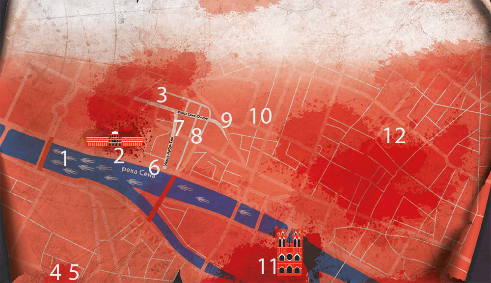 Варфоломеевская ночь — страшная страница в истории Франции. Историки до сих пор спорят, была ли массовая резня гугенотов подготовлена заранее, или же она произошла стихийно. Вот как выглядят события 24 августа 1572 года на карте Парижа.