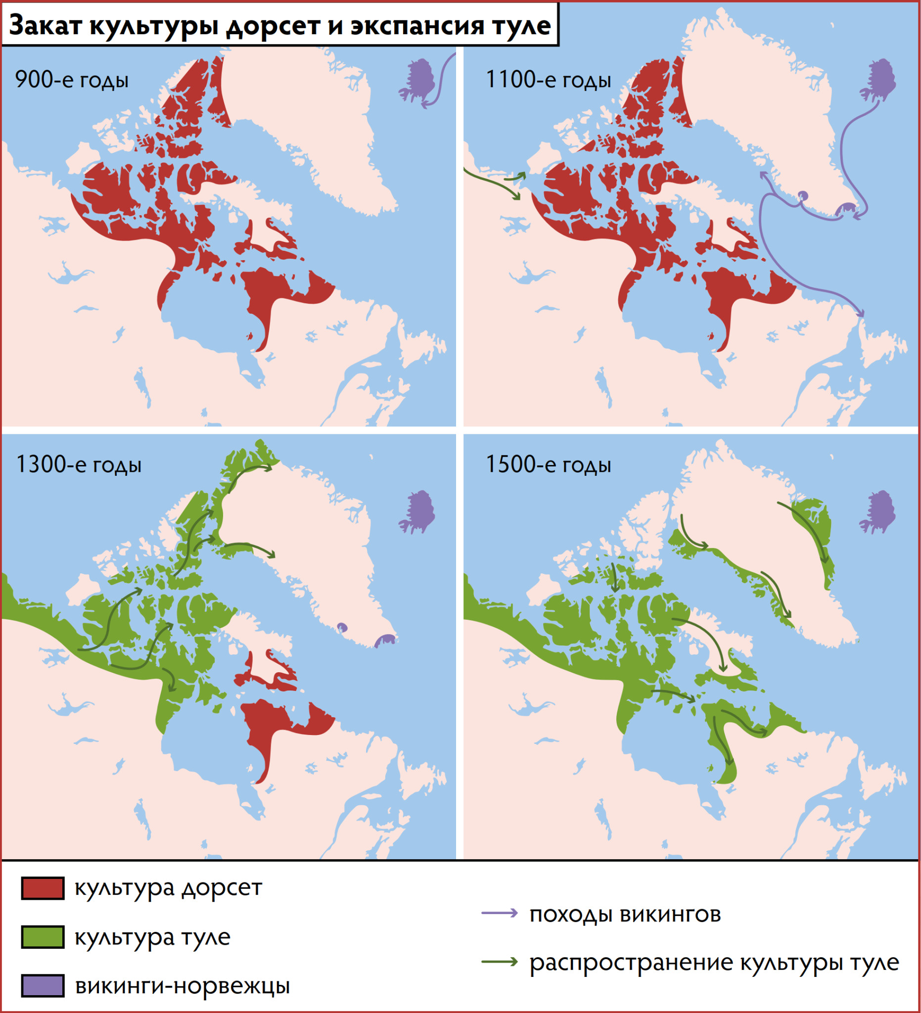 Когда в Гренландию прибыли первые скандинавские поселенцы, похоже, там ещё оставались немногочисленные потомки палеоэскимосов, последние представители культуры дорсет. Позднее их полностью вытеснят представители культуры туле — согласно исследованиям, они пришли сюда с Аляски, а генетически входят в одну группу популяций арктической расы с коряками и ительменами.