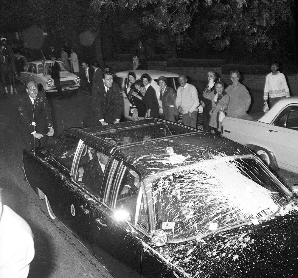 Лимузин президента США Линдона Джонсона во время протестов против войны во Вьетнаме
