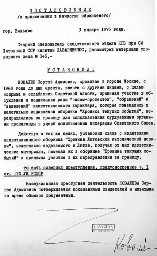 Ковалёва почти сразу этапируют из Москвы в Вильнюс — при обыске найдены три выпуска «Хроники Литовской католической церкви», он обвинён в их хранении и использовании материалов для подготовки соответствующих разделов «Хроники текущих событий». А значит, допрашивать и судить его будут в Литовской ССР.