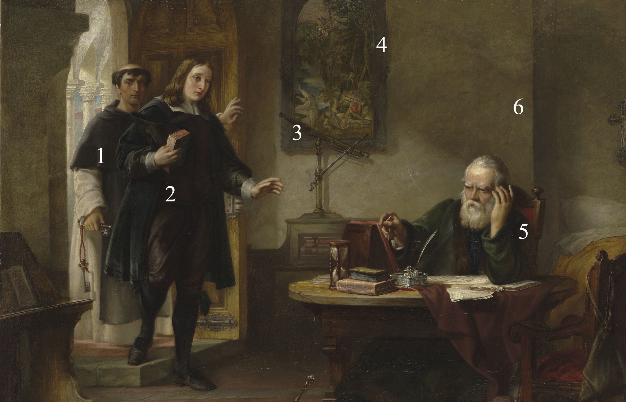 Холст британского художника Соломона Харта запечатлел Галилео Галилея в последний период его жизни, проведённый им в домашнем заточении. Замена тюремного срока на домашний арест была решением главы католической церкви после вынужденного отречения Галилея от гелиоцентризма — теории, которую Ватикан признавал ересью. Навестивший его в 1638 году английский поэт Джон Мильтон напишет позже, что Галилею пришлось состариться в плену за то, что думал об астрономии иначе, чем францисканские и доминиканские цензоры. Оба героя этой картины в старости ослепли.