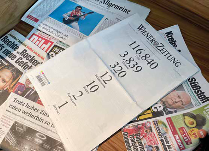 Нет, это не моя история. И не наша, не российская. Увы. Это история одной из старейших в мире ежедневных газет Wiener Zeitung («Венская газета»), насчитывающая ровно 320 лет: её первый выпуск появился на свет в 1703 году, ещё в Священной Римской Империи, а 30 июня 2023 года вышел последний печатный ежедневный номер, поскольку газета продолжит выходить онлайн, в цифровом формате.