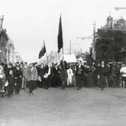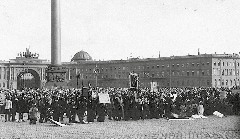 Тем не менее в первые дни войны официальная печать начинает конструировать патриотическую мифологию. Один из примеров — имевшее якобы место на Дворцовой площади массовое коленопреклонение народа в момент выхода Николая II на балкон Зимнего дворца после подписания манифеста об объявлении войны Германии. При реальной толпе в несколько десятков тысяч печать поднимала число демонстрантов до четверти миллиона (хотя максимальная вместимость Дворцовой площади — 100 тысяч). Газеты и журналы публиковали фотографии, однако внимательный зритель без труда мог заметить, что толпа едва ли занимала половину площади, а на колени опускались стоявшие отдельным рядом монархисты — несколько десятков человек. Демонстрация на Дворцовой площади оканчивалась проводами мобилизованных. Некий студент, наблюдавший за движением «патриотической» толпы по Невскому проспекту, писал своему другу: «Рабочие, запасные и провожающие их поют “Марсельезу” со словами “Царь вампир пьёт народную кровь…”, которые, ты знаешь, для царя нелестны. Не особенно приятны для него “Варшавянка” и “Похоронный марш”, которые они пели. При пении “Похоронного марша” офицеры и городовые снимали фуражки».